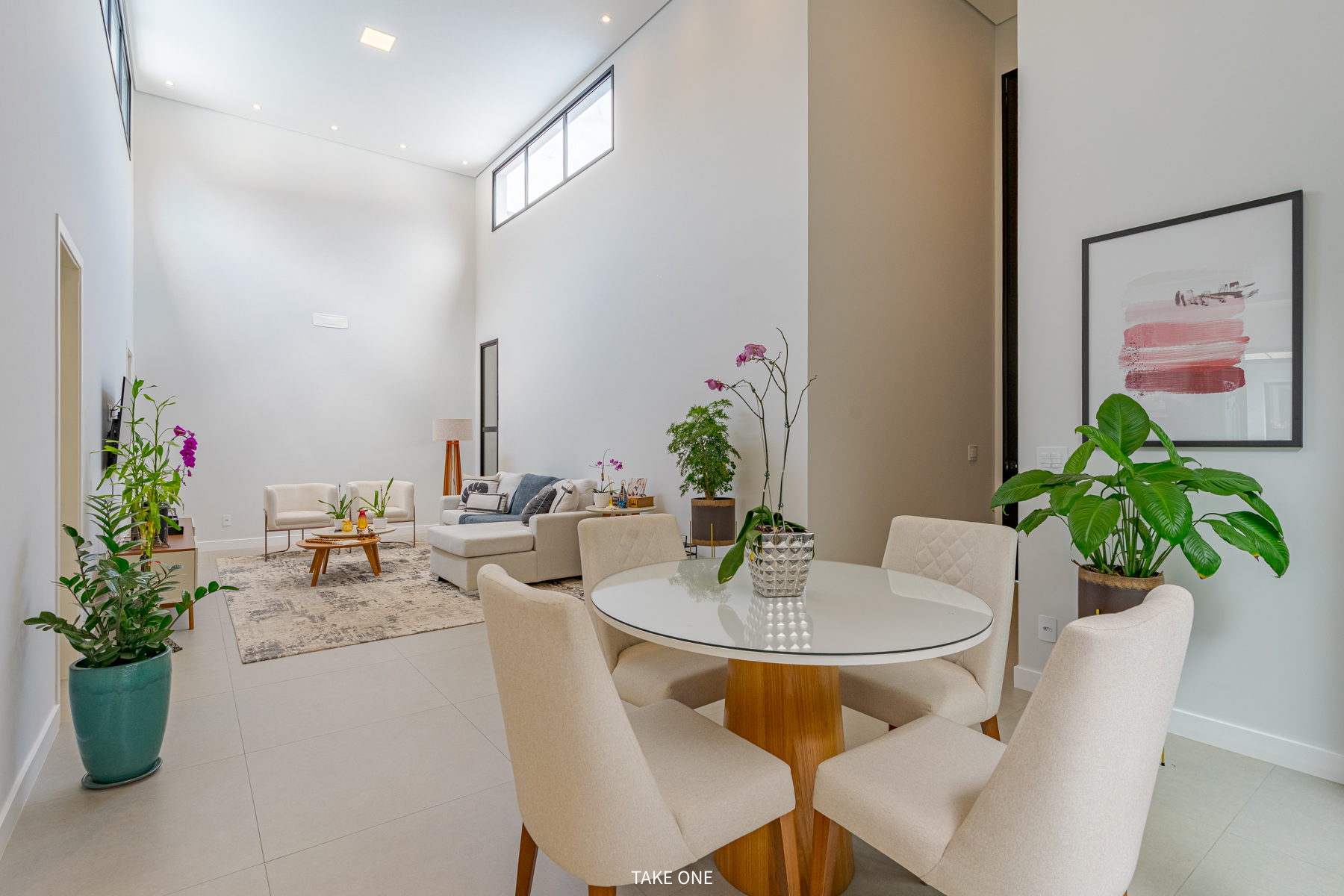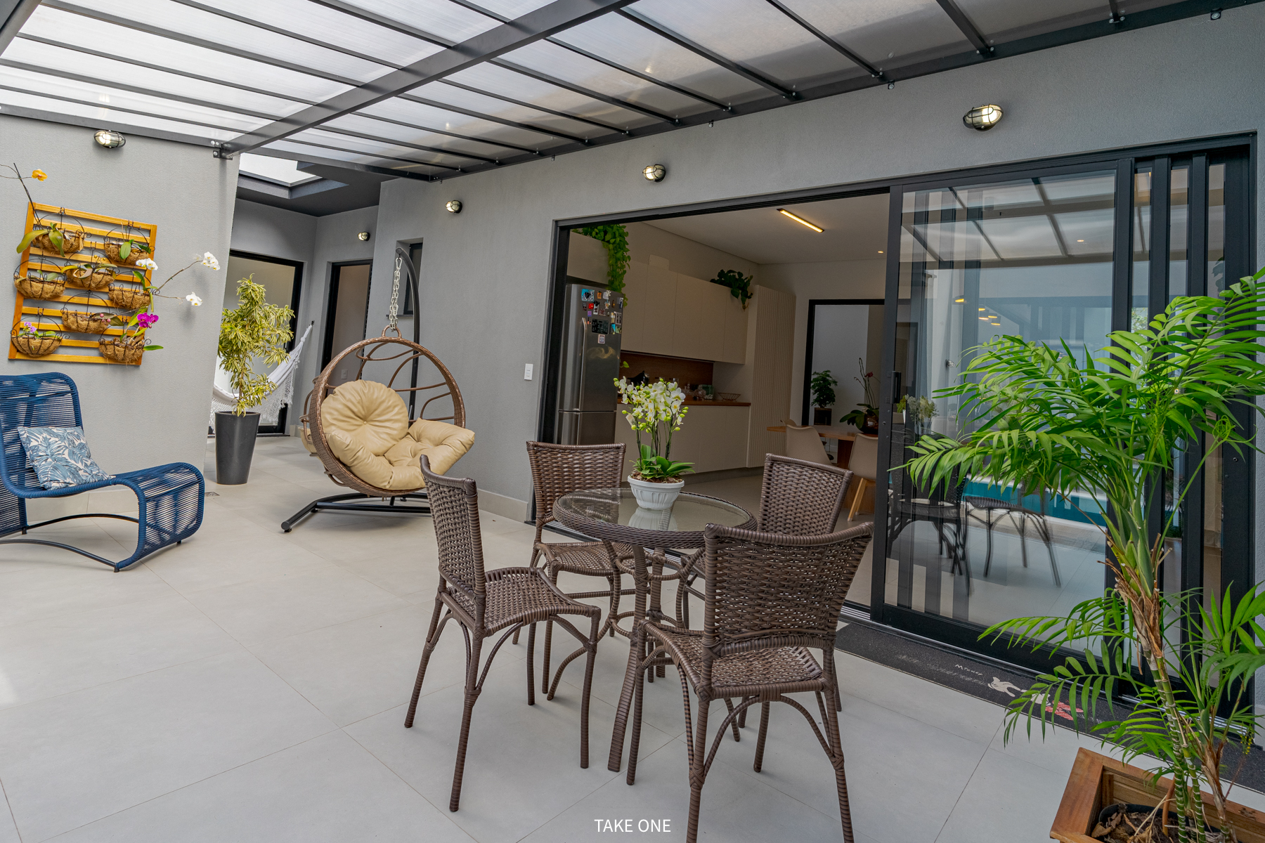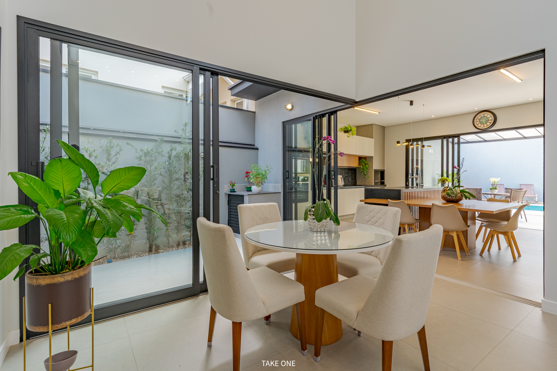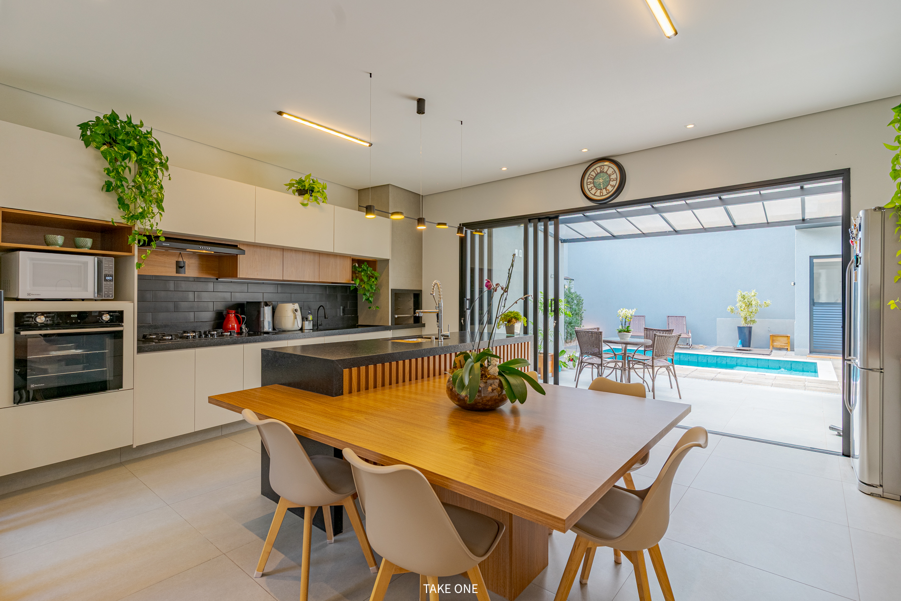 Com distribuição inteligente e sob medida, o projeto é minimalista, arejado, iluminado por luz natural e de fácil manutenção. Os ambientes são integrados: salas, cozinha e área de lazer se conectam de forma harmoniosa.