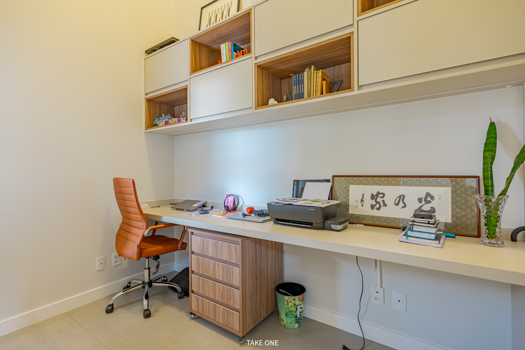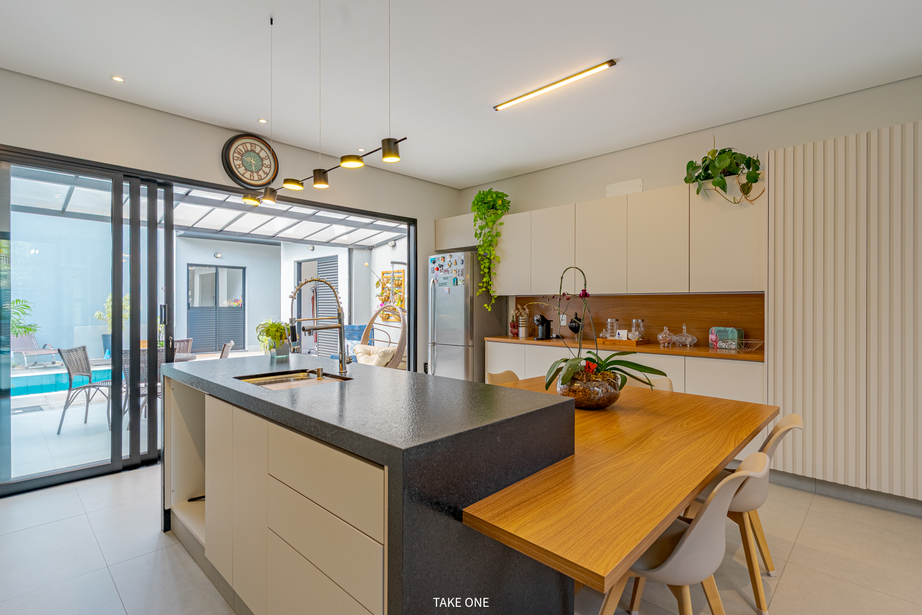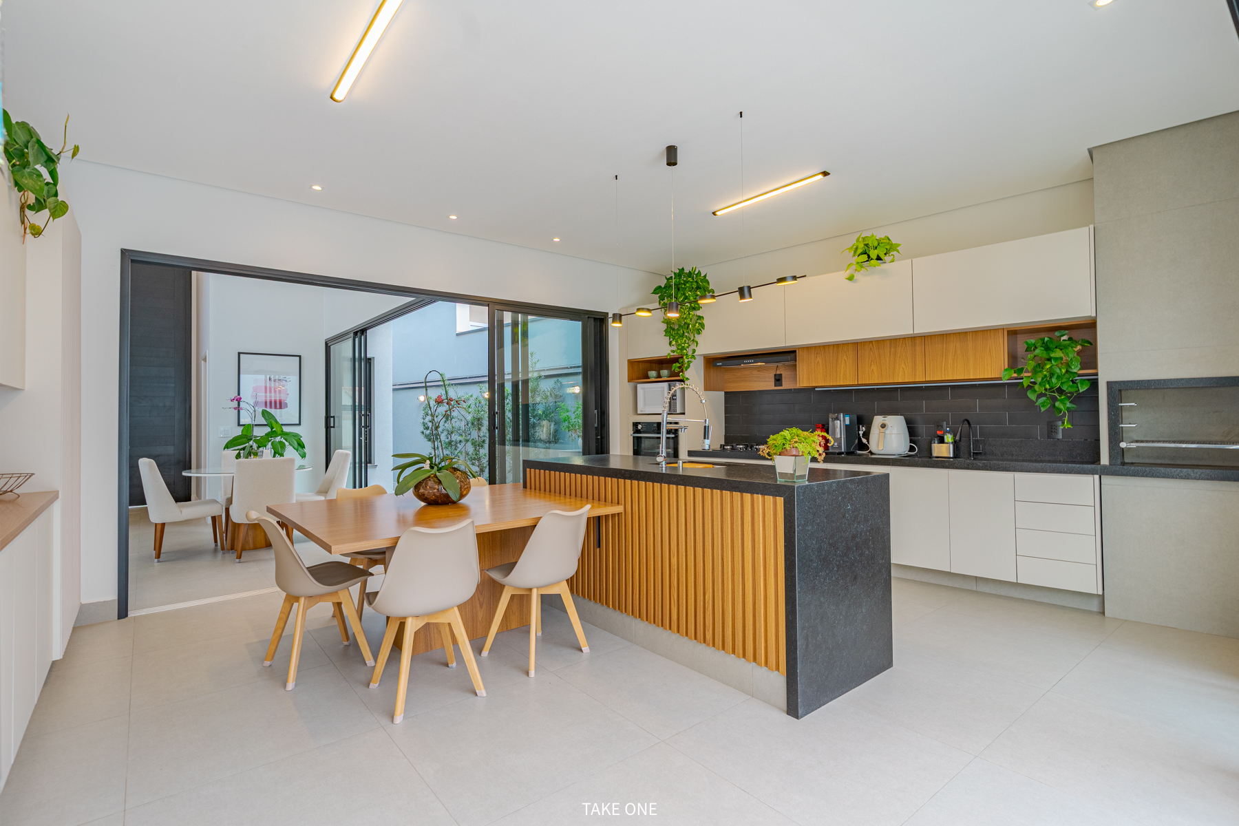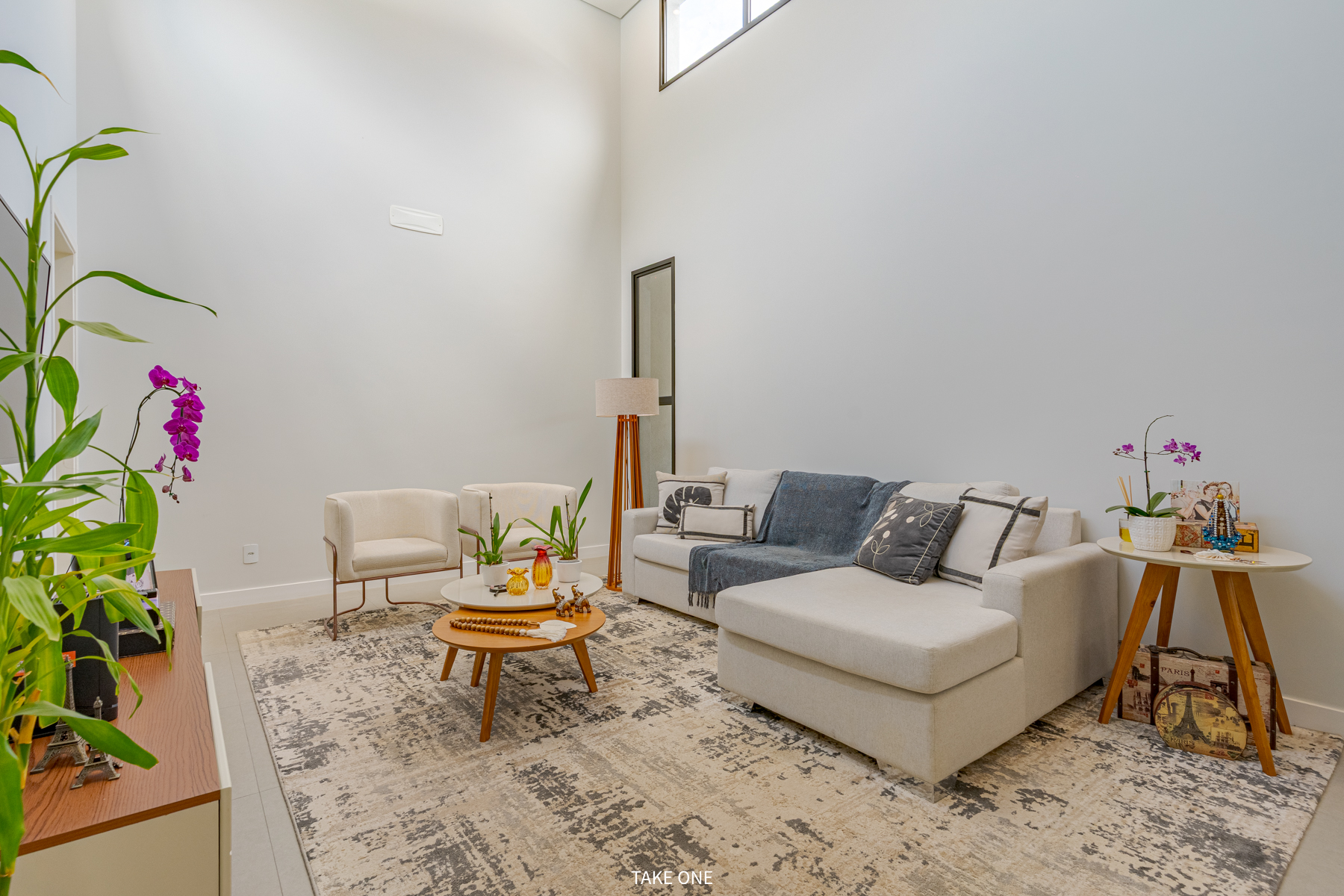 Com distribuição inteligente e sob medida, o projeto é minimalista, arejado, iluminado por luz natural e de fácil manutenção. Os ambientes são integrados: salas, cozinha e área de lazer se conectam de forma harmoniosa.