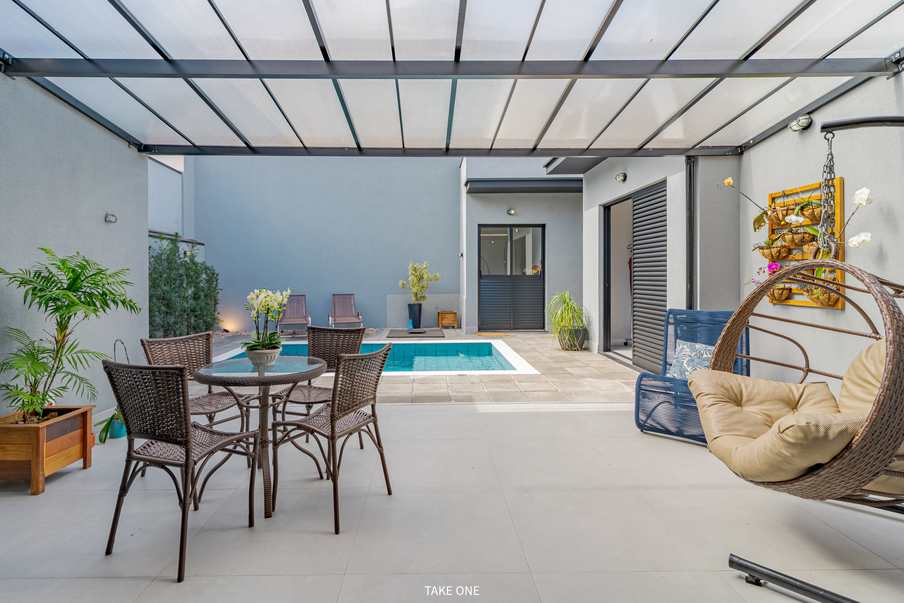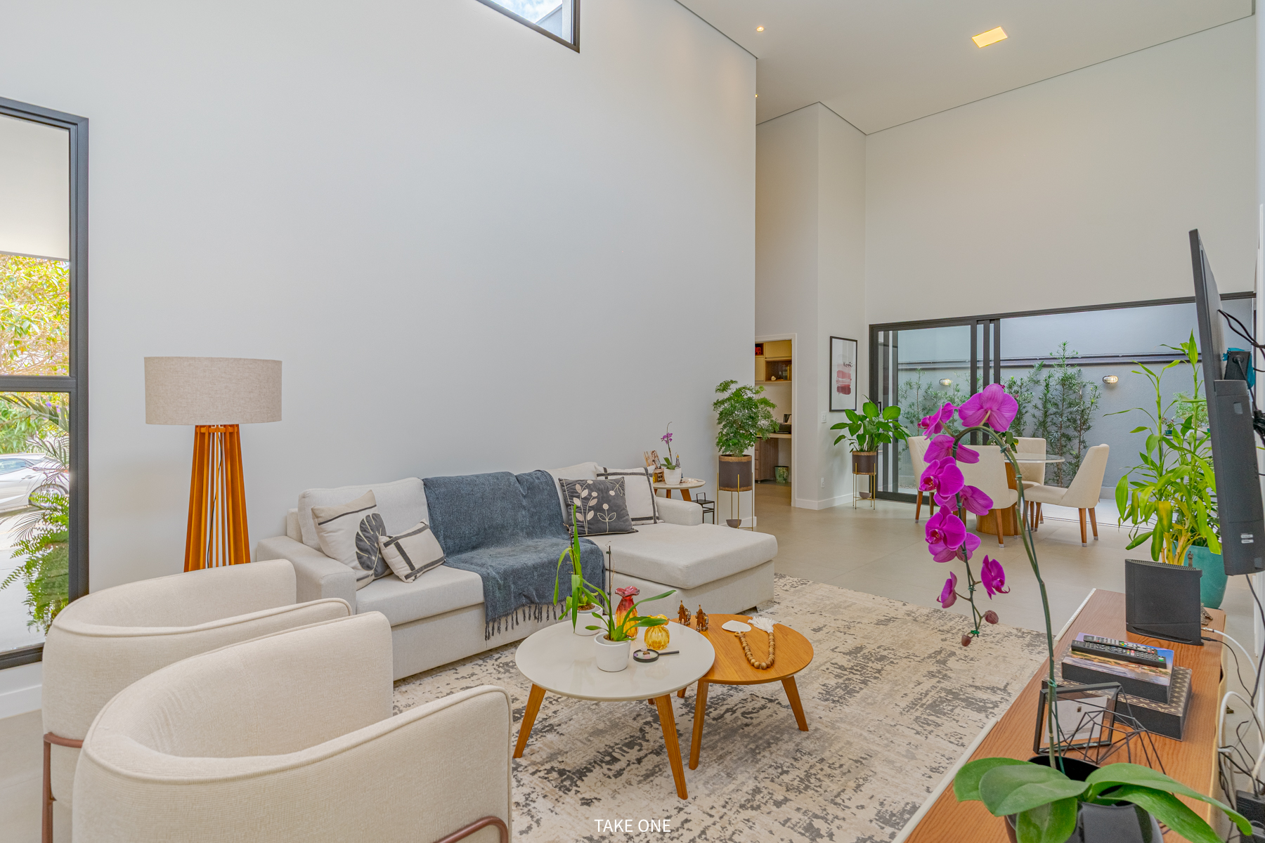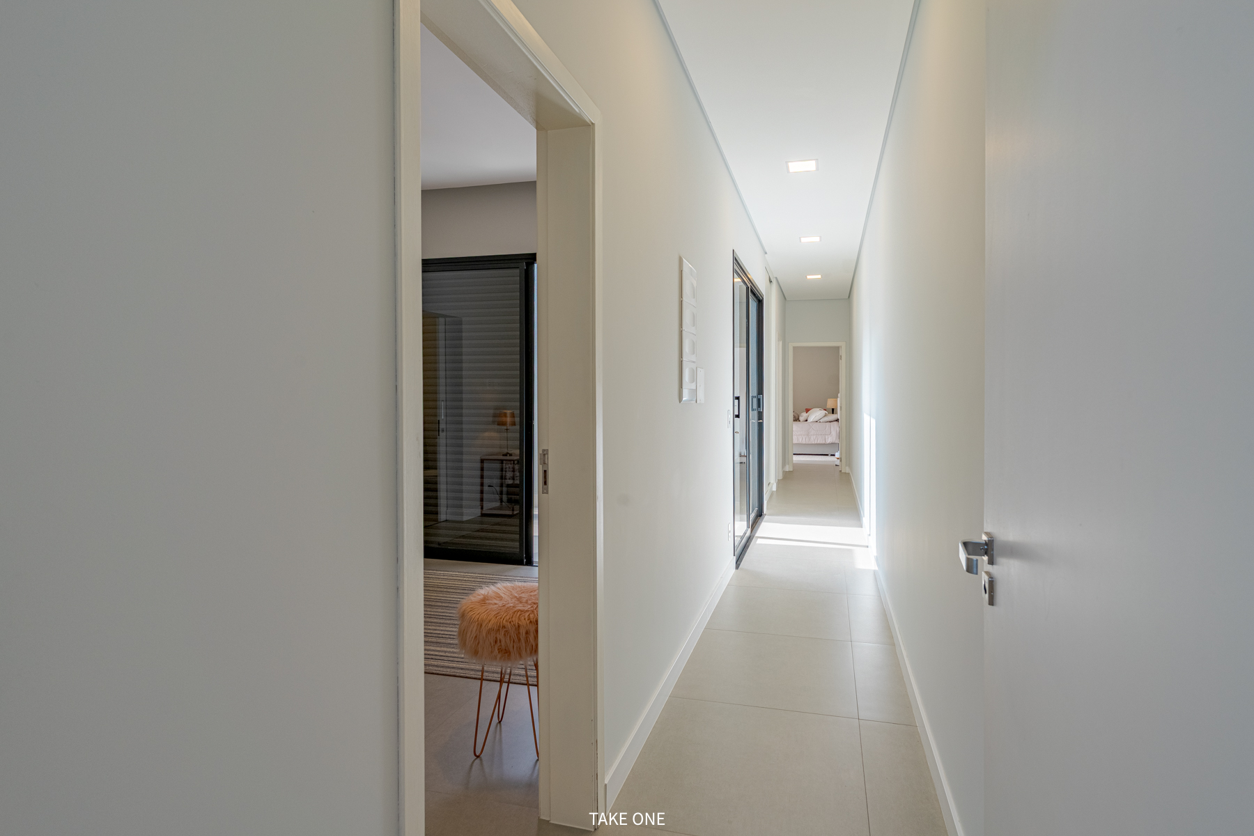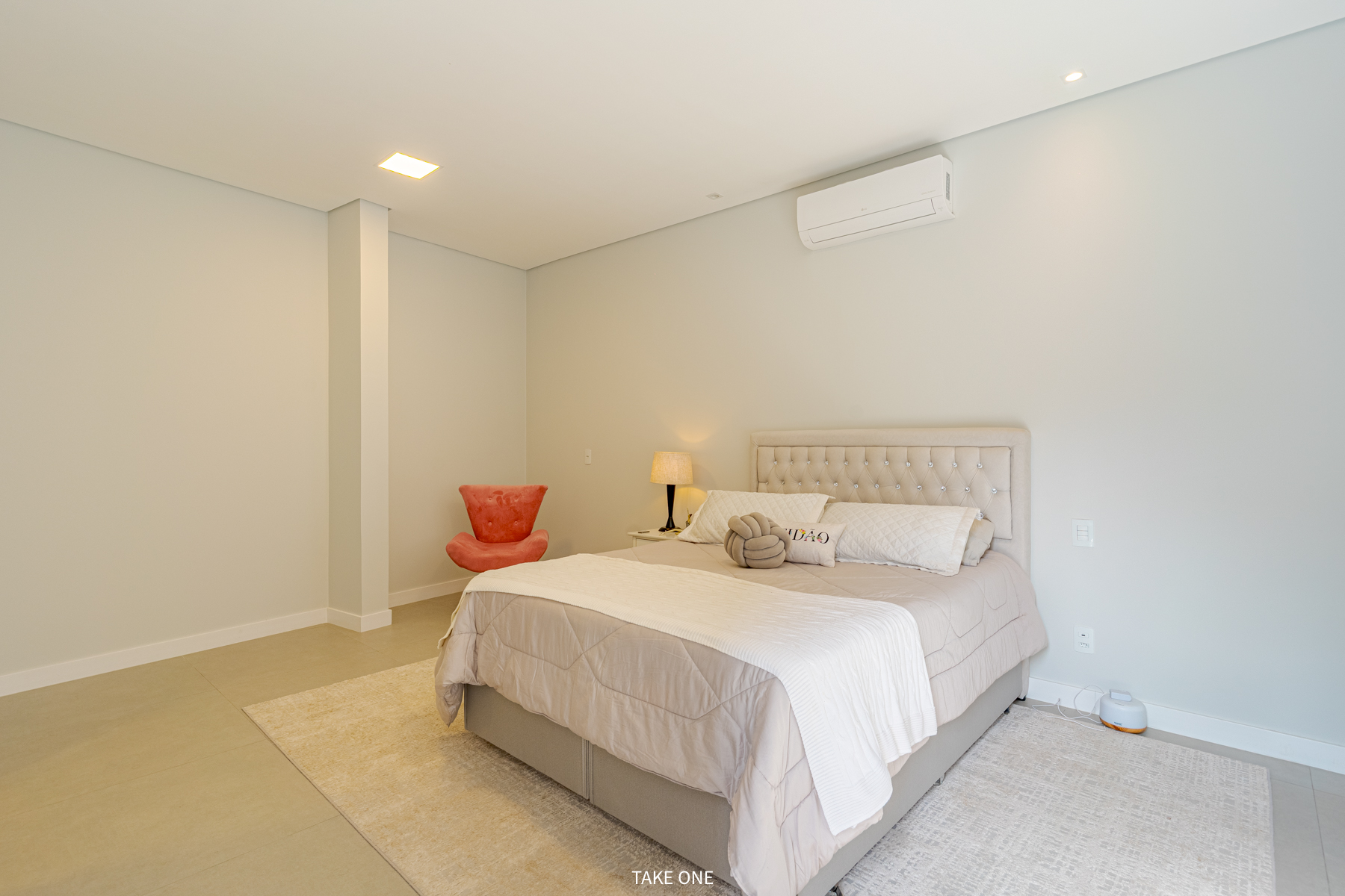 Com distribuição inteligente e sob medida, o projeto é minimalista, arejado, iluminado por luz natural e de fácil manutenção. Os ambientes são integrados: salas, cozinha e área de lazer se conectam de forma harmoniosa.